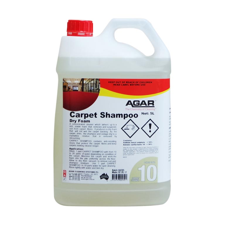 CARPET SHAMPOO is a concentrated cleaner which lathers up to a rich, stable foam that removes and suspends soil from carpet fibres. It produces a dry foam that will not wet the carpet backing.